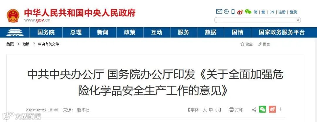 近日,中共中央办公厅、国务院办公厅印发了《关于全面加强危险化学品安全生产工作的意见》,并发出通知,要求各地区各部门结合实际认真贯彻落实。