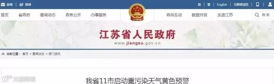 经江苏省环境监测中心与省气象台会商,受不利气象条件影响,江苏全省大气扩散条件较差,自12月3日12时起,南京、无锡、徐州、常州、苏州、南通、淮安、扬州、镇江、泰州和宿迁11市启动重污染天气黄色预警。