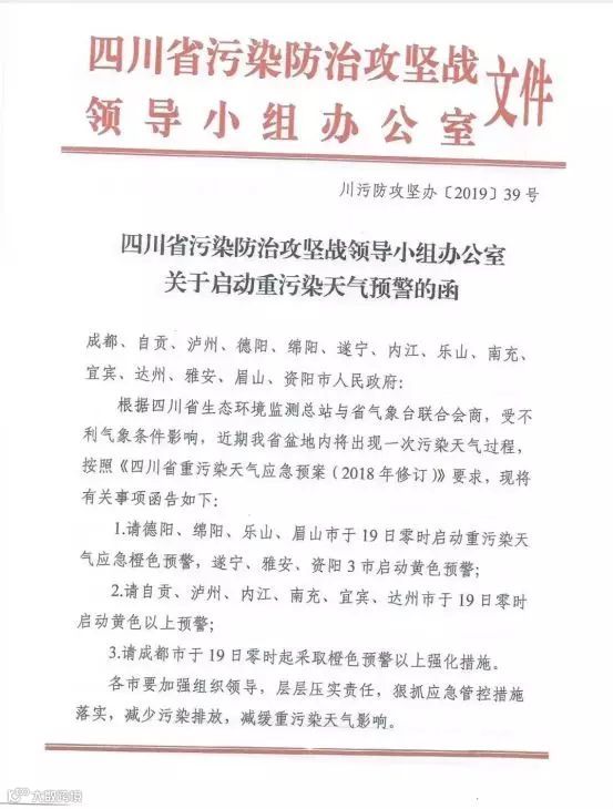 2019年12月17日四川再次启动预警,19日零时起启动四川成都、自贡、泸州、德阳、绵阳、遂宁、内江、乐山、南充、宜宾、达州、雅安、眉山、资阳黄色及橙色空气质量预警。