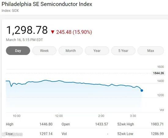 两周内出现三次熔断,金融危机不过如此。昨天,道指收盘狂跌3000点,创史上最大单日下跌点数,收跌12.93%,纳指跌逾12%,费城半导体指数大跌近16%!标普500指数开盘后触发本月第三次熔断,最终收跌11.98%,创为33年来最大跌幅。再跌可能就渣都没了!
