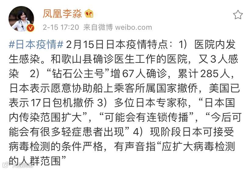 据凤凰卫视驻东京首席记者李淼@凤凰李淼 的消息,日本厚生劳动大臣表示,由于一些新确诊患者无法确认感染途径,因此,“日本国内疫情进入了新局面”。由于日本对于“流行”这个词非常谨慎,现阶段,厚生劳动大臣没有使用“日本已流行新冠病毒”这样的措辞。要等明天的专家会议之后做决定。