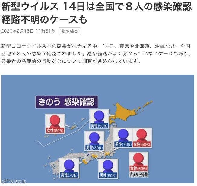 日本厚生劳动省14日通报,当天新增8例确诊病例,全部是日本公民,其中7名患者分别来自东京、北海道、神奈川、爱知、和歌山、冲绳,还有1名患者刚从武汉乘坐撤侨飞机抵达日本,正在隔离。