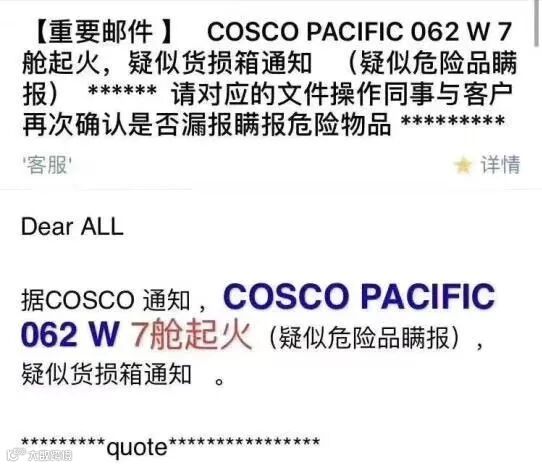起火原因疑是危险品瞒报,目前事故导致船舶被迫改港停靠,船期出现延误,而且货损情况尚未清楚!