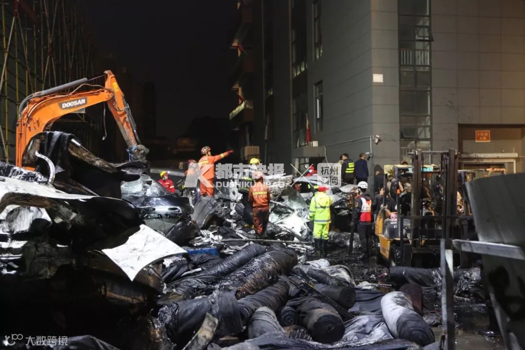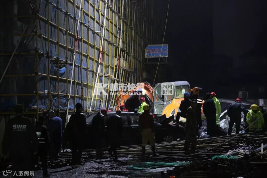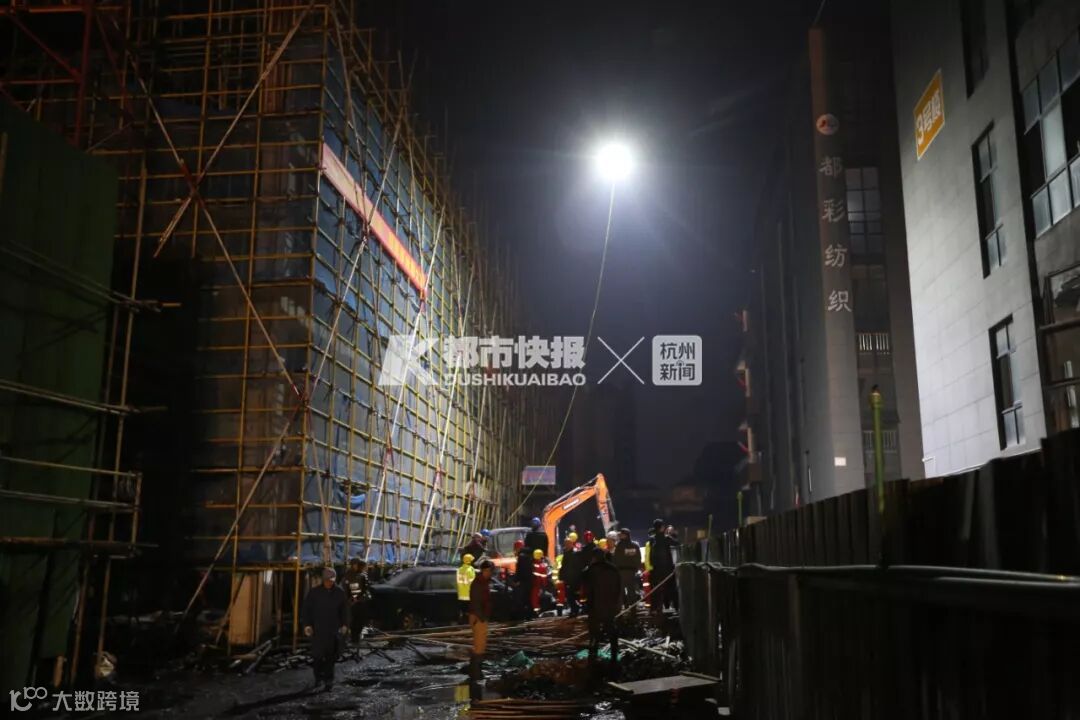 钱江晚报记者在事故现场看到,这里灯火通明,数百名救援人员正在紧急搜救。一台挖掘机正在施工作业,一遍遍翻着底下的布料。