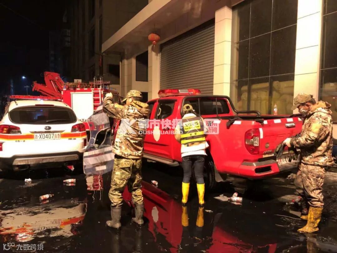 救援人员在现场开展救援,地上到处是黑色的污水