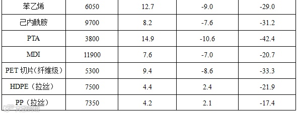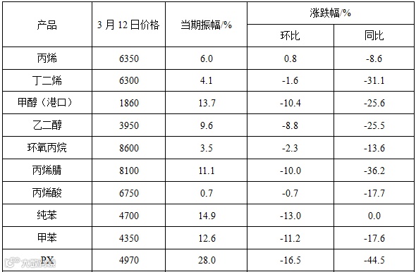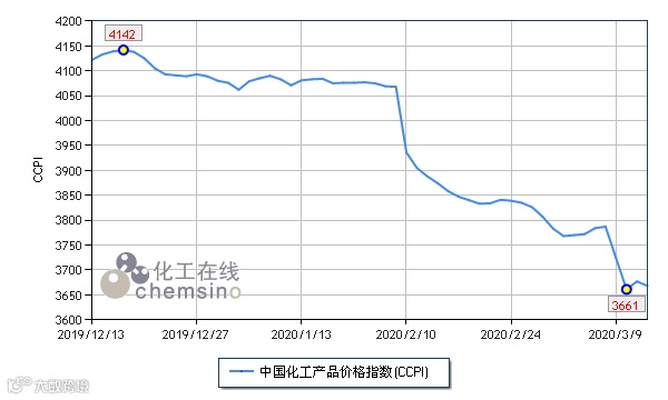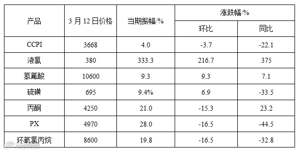 受多方利空叠加影响,化工在线发布的化工价格指数(CCPI)于3月12日收于3668点,跌幅为3.7%,创三年半新低。在统计的160个产品中,上涨的产品仅有33个,占产品总数的20.6%;下跌的产品多达101个,占产品总数的63.1%;持平的产品为26个,占产品总数的16.3%。产品涨跌幅见表1、表2。
