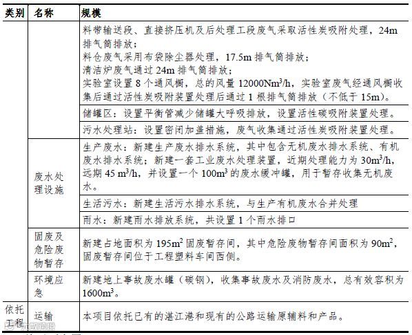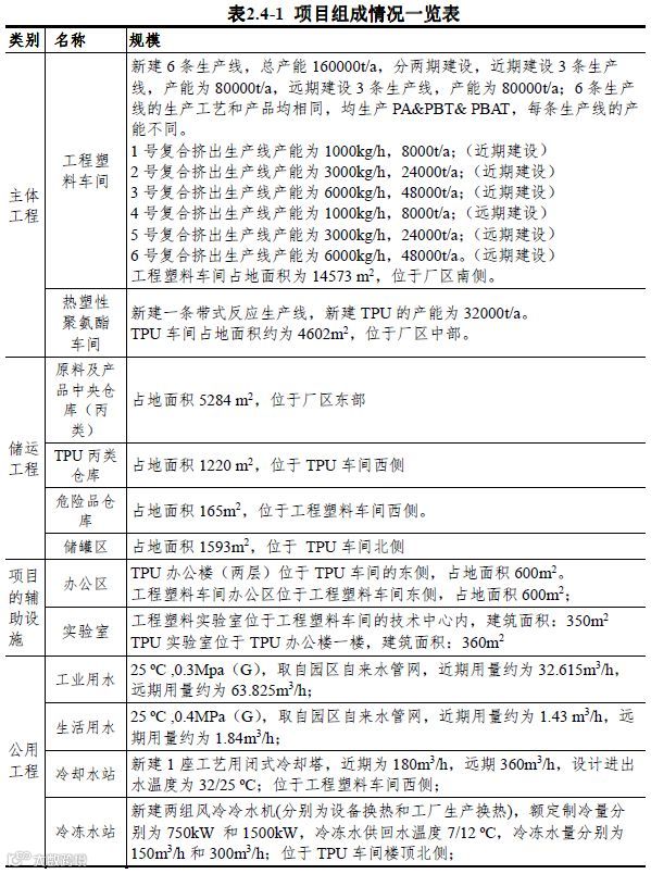 其中,工程塑料分两期建设,每期8万吨/年,1-3号生产线近期建成,4-6生产线远期建成;其他所有生产设施及公用工程配套工程均在近期一次性建成。