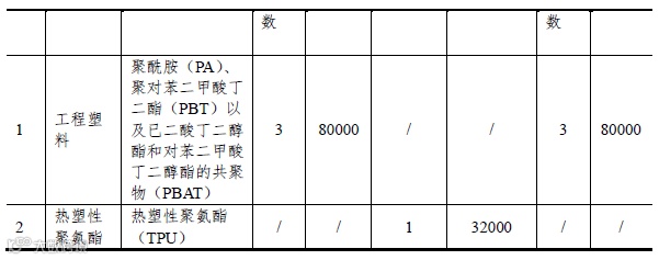 项目主要产品为工程塑料(聚对苯二甲酸丁二酯(PBT)和聚酰胺(PA)、乙二酸丁二醇酯和对苯二甲酸丁二醇酯的共聚物(PBAT))和热塑性聚氨酯。