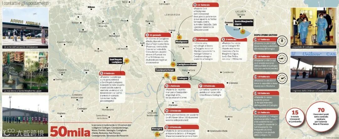 意大利媒体公布的“一号病人”行动轨迹图,图中文字表示有5万人、10个城镇受到他的影响