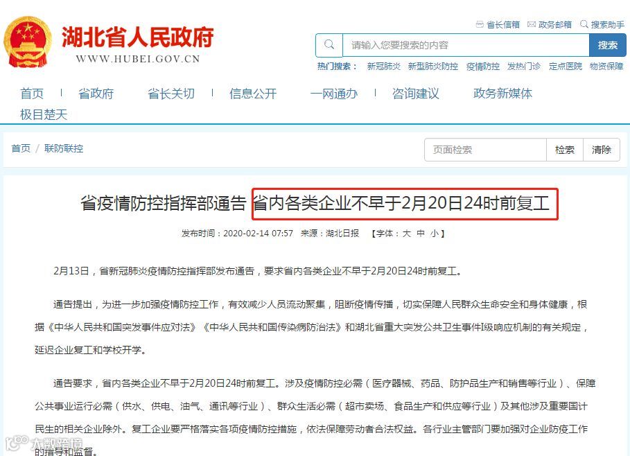 自2月12日至今,湖北地区疫情大爆发,单日新增确诊人数竟飙升到上万人。为此在昨天(即2月13日),湖北省发布公告称省内各类企业不早于2月20日24时复工。湖北省的复工时间,比其他省份的复工时间延长了10天。