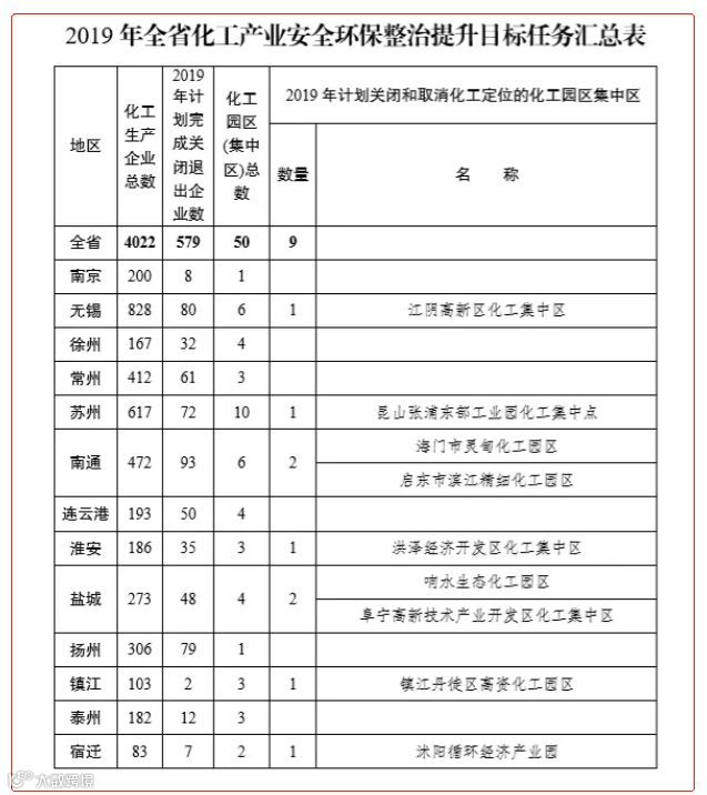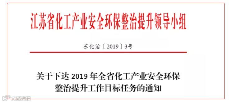 近日,江苏省化工产业安全环保整治提升领导小组,下发一则关于下达2019年全省化工产业安全环保整治提升工作目标任务的通知。