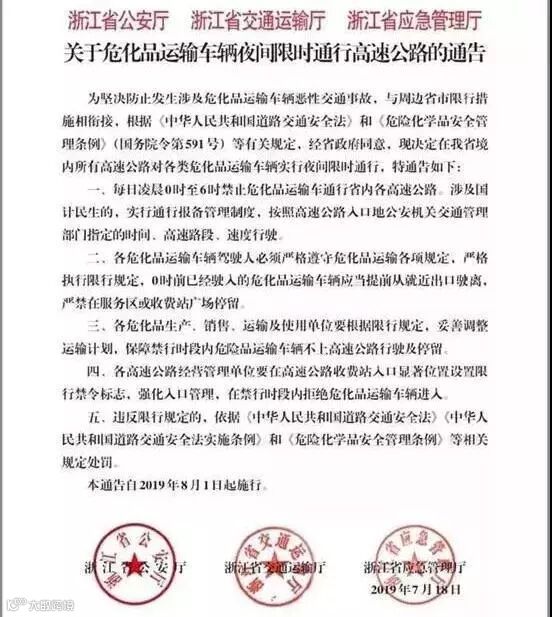 据此,自2017年以来,浙江省公安厅、交通运输厅、应急管理厅经过深入调查研究、充分交流磋商,调研了部分省份实施夜间限行后的情况,并征集了相关危化品企业的意见建议后,三部门提出了浙江省高速公路施行危化品运输车辆夜间限时通行的意见。今年7月,经浙江省政府同意,决定于2019年8月1日起在全省高速公路正式施行危化品运输车辆夜间限时通行政策。