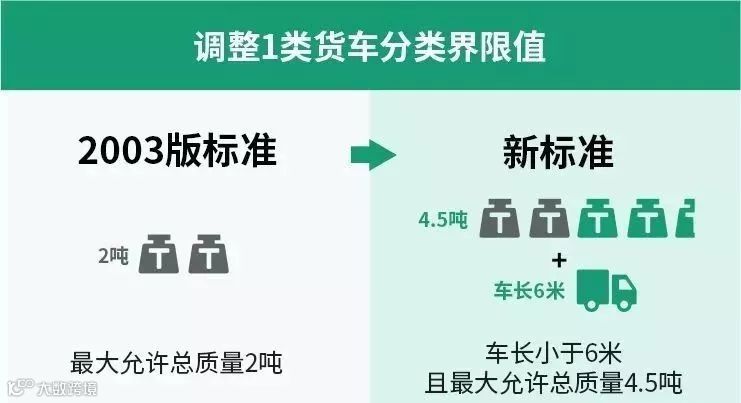 新的车型划分标准中,将1类和2类货车分类界限值,确定为车长小于6米且允许总质量4.5吨。