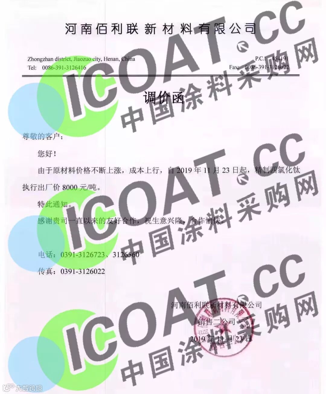 导读:近日,河南佰利联新材料有限公司发布调价函,称由于成本上行,其生产的精致四氯化钛执行出厂价8000元/吨。11