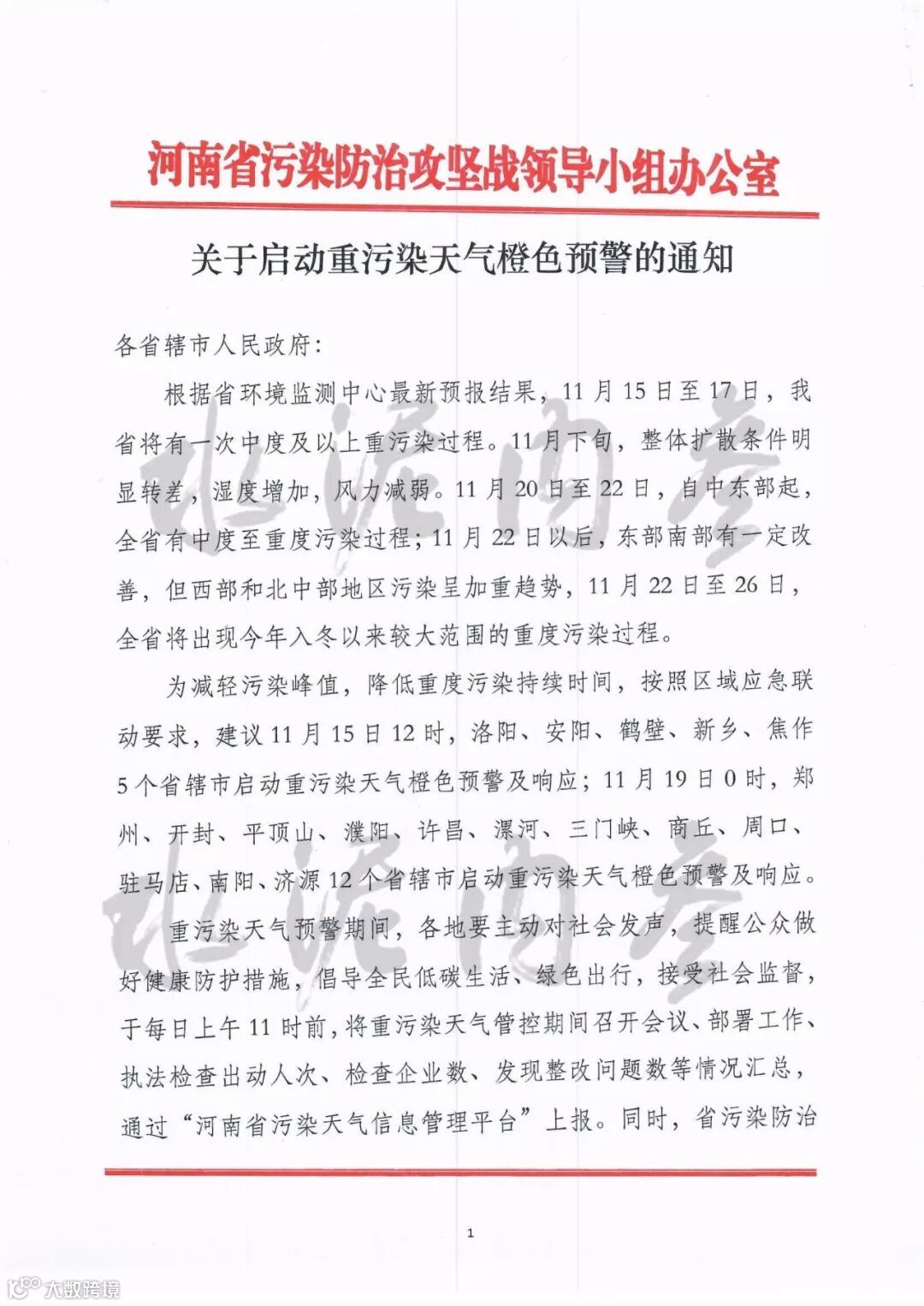 据了解,昨日(11月14日),河南省人民政府发布《关于印发河南省重污染天气应急预案的通知》称:当预测可能出现上述重污染天气时,应当按空气质量预报结果上限确定预警级别。当全省6个及以上相邻的省辖市(济源产城融合示范区)同时达到橙色或红色预警条件时,启动该级别的省级预警。当发布橙色预警时,启动Ⅱ级应急响应。