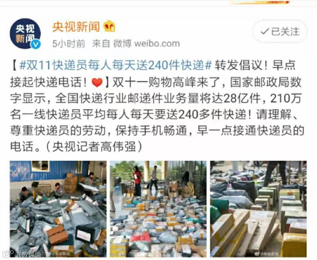双十一购物高峰来了,国家邮政局数字显示,全国快递行业邮递件业务量将达28亿件,210万名一线快递员平均每人每天要送240多件快递!请理解、尊重快递员的劳动,保持手机畅通,早一点接通快递员的电话。