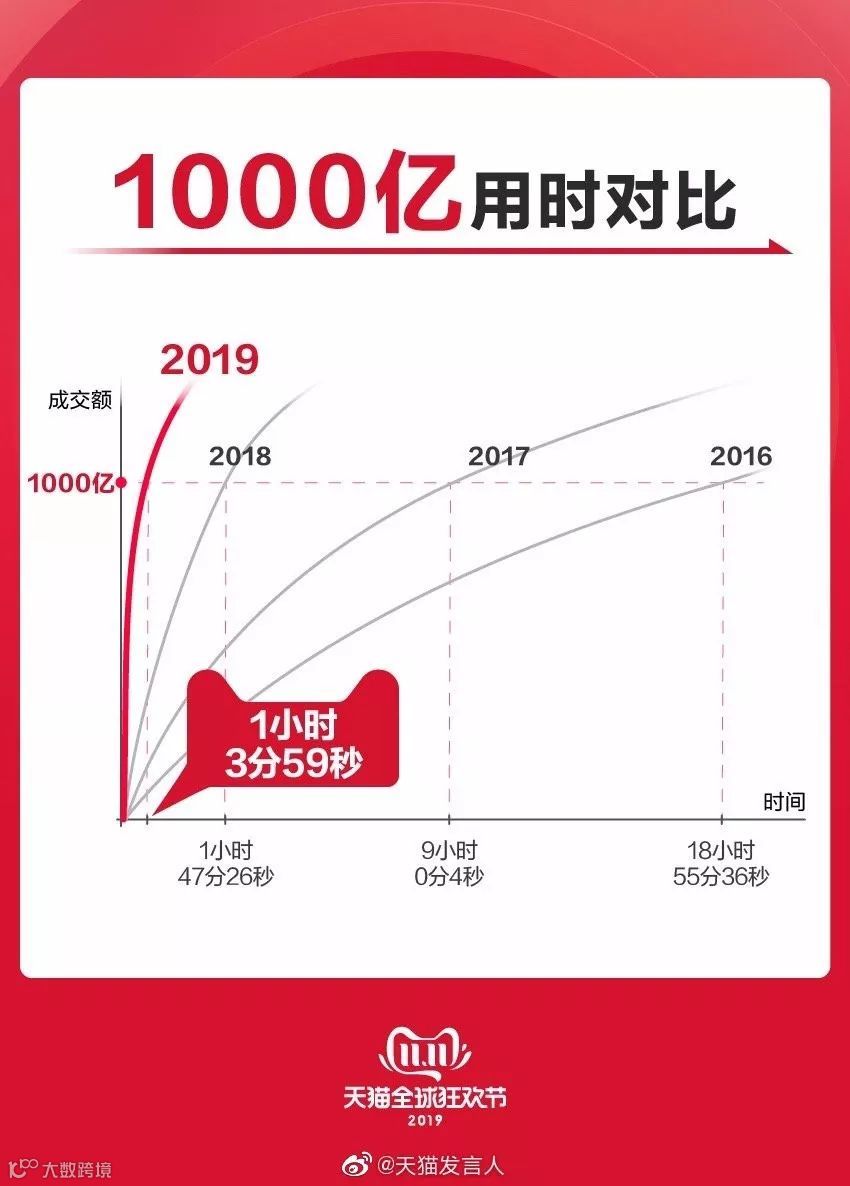 1小时03分59秒,天猫双11成交总额冲破1000亿大关,比2018年快了43分钟25秒,比2017年快了将近8小时。
