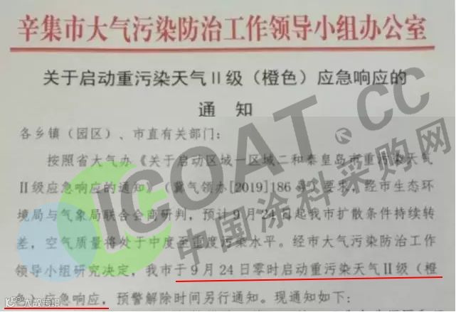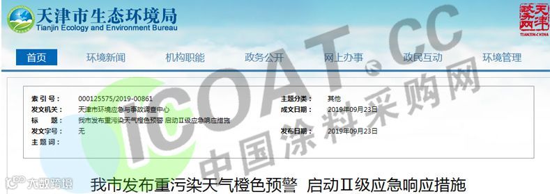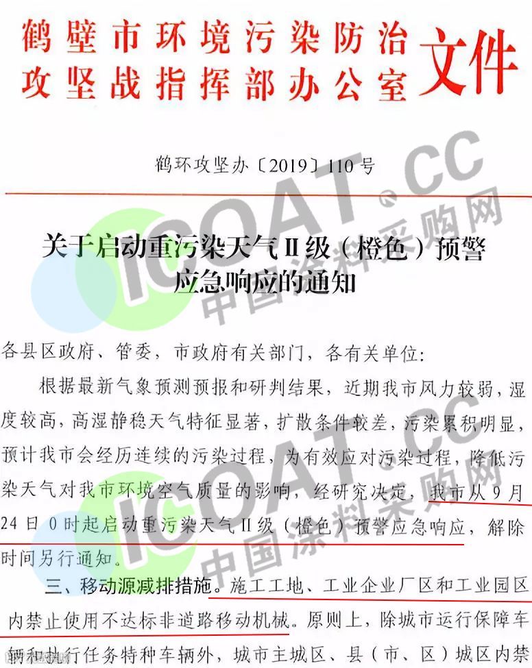 邯郸:自2019年9月23日24时起,发布重污染天气橙色预警启动II级应急响应强化措施,化工、涂装、印刷等涉尘、涉气排放重点行业企业全部停产。所有施工工地停止一切室外施工作业,室内施工不得进行涉尘、涉气作业。