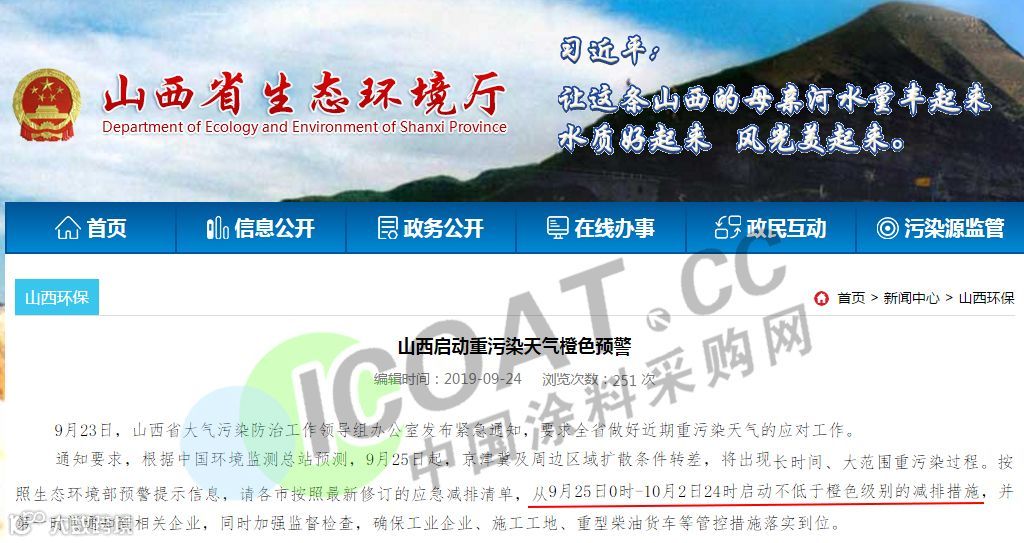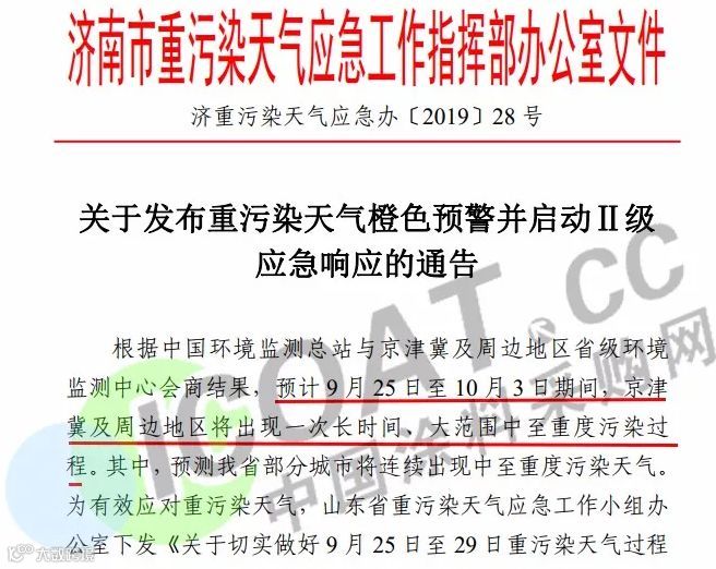 太原:9月25日0时-10月2日24时启动重污染天气应急预案橙色(二级)响应。施工工地、工业企业厂区及工业园内停止使用国二及以下非道路移动机械(清洁能源和紧急抢修作业机械除外);化工等重点行业涉及大宗物料运输的企业按照“工业源减排清单”中橙色预警车辆运输减排要求执行;除应急抢险外,所有施工工地的喷涂粉刷等易起尘作业全部停止。