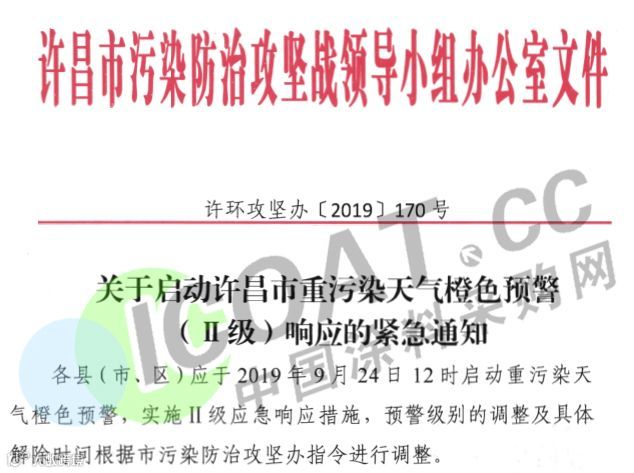 许昌:9月24日12时启动重污染天气橙色预警,实施II级应急响应措施,确保挥发性有机物减排比例达到全社会排放总量的20%以上。使用溶剂型涂料的家具制造企业、使用溶剂型油墨的包装印刷企业(不含书报刊、本册平板印刷)停产。使用非溶剂型涂料的家具制造企业、使用溶剂型油墨的包装印刷企业(不含书报刊、本册平板印刷)及使用低VOCs含量涂料的工业涂装企业限产50%(以生产线计),涂料制造及使用溶剂型涂料的工业涂装企业涉VOCs工序停产。