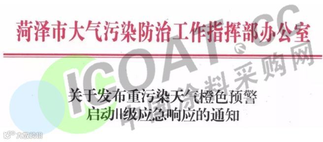 滨州:自9月23日零时前发布橙色预警,9月24日零时前启动II级应急响应。要求挥发性有机物VOCs等主要污染物减排比例应达到20%以上。施工工地停止喷涂粉刷、护坡喷浆等。倡导公众绿色消费,单位和公众尽量减少含挥发性有机物的涂料、油漆、溶剂等原材料及产品的使用。