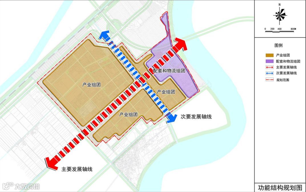 四组团:三个产业组团,一个配套和物流组团。