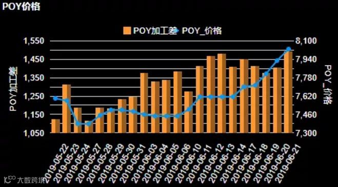 上周POY上涨幅度较大,加工差接近1500,动能上为上涨趋势。