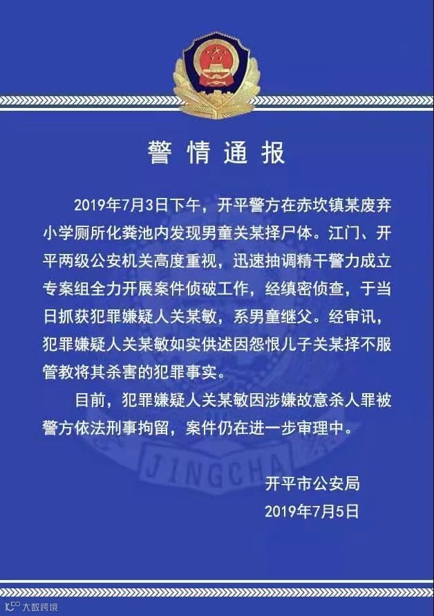 据@广东开平公安 通报,2019年7月3日下午,开平警方在赤坎镇某废弃小学厕所化粪池内发现男童关某择尸体。江门、开平两级公安机关高度重视,经缜密侦查,于当日抓获犯罪嫌疑人关某敏,系男童继父。经审讯,犯罪嫌疑人关某敏如实供述因怨恨儿子关某择不服管教将其杀害的犯罪事实。目前,犯罪嫌疑人关某敏因涉嫌故意杀人罪被警方依法刑事拘留,案件仍在进一步审理中。