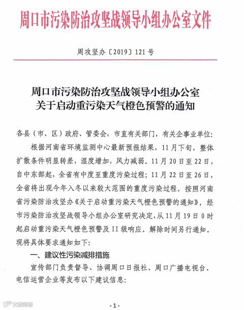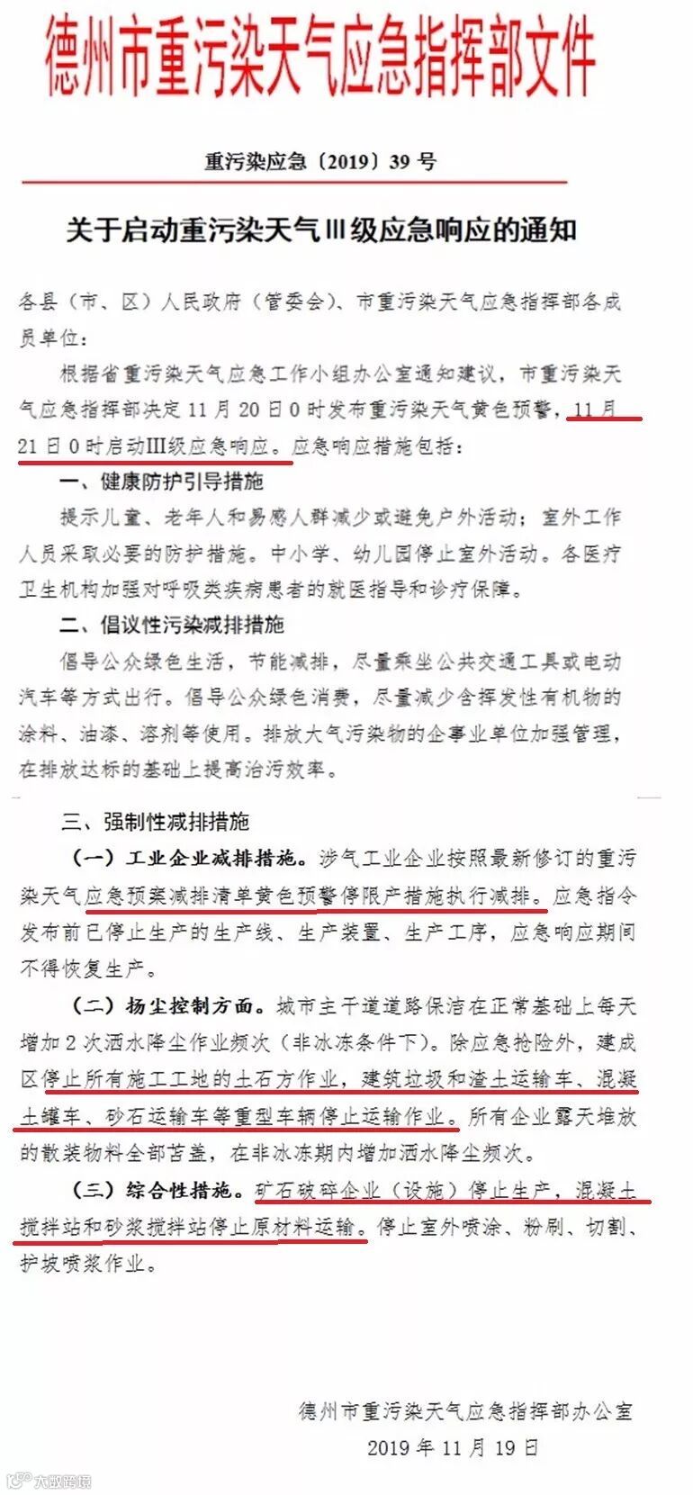 11月19日,市重污染天气应急指挥部发布通知,根据省重污染天气应急工作小组办公室通知建议,市重污染天气应急指挥部决定11月20日0时发布重污染天气黄色预警,11月21日0时启动重污染天气Ⅲ级应急响应。