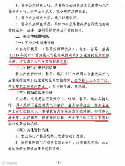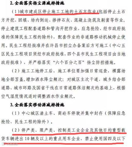 扬尘源减排方面。建设工地必须采取湿法作业和喷淋、冲洗、洒水等措施有效除尘,监测数据高于周边国省控站监测数据的工地停止施工。全市停止室外喷涂、粉刷、切割、护坡喷浆作业;除应急抢险和重大民生工程外,停止土石方、拆除作业;水泥粉磨站、砂石厂(场)、渣土存放点停止生产、运行;中心城区停止商品混凝土的拌和、运输。