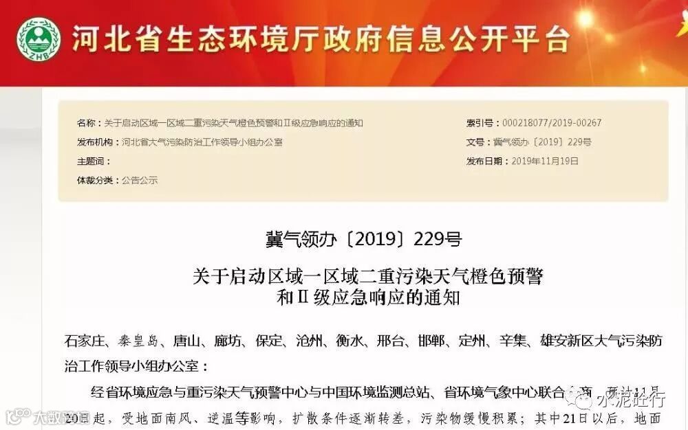 19日,河北省大气污染防治工作领导小组办公室发布《关于启动区域一区域二重污染天气橙色预警和Ⅱ级应急响应的通知》。