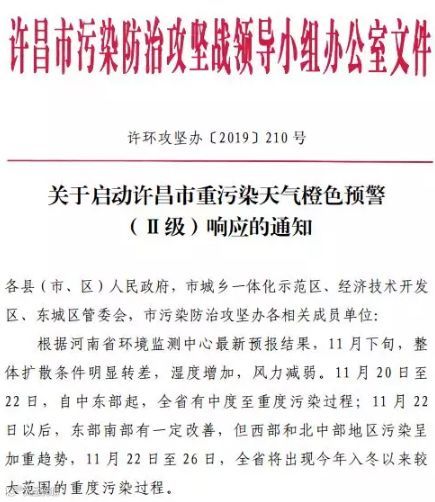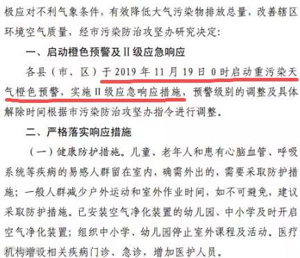 为保护公众健康,降低大气污染强度,指挥部办公室决定于11月20日13:30时发布重污染天气橙色预警信息,从2019年11月20日16时起启动Ⅱ级应急响应。