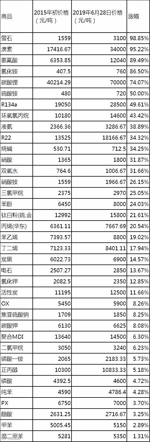 第一次环保督察时,化工厂关闭,化工原料飞涨,局部地区出现断货情况。除此之外,任何一个突发事故都有可能会造成部分原材料价格异动。近四年来,国内部分化工产品价格涨幅如下: