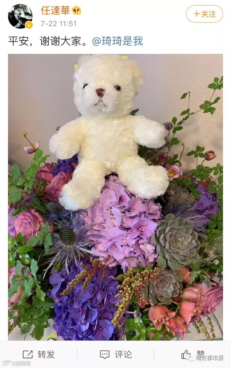 今日上午,任达华被刺后首次发微博报平安,其写道“平安,谢谢大家。”,还圈了妻子琦琦。