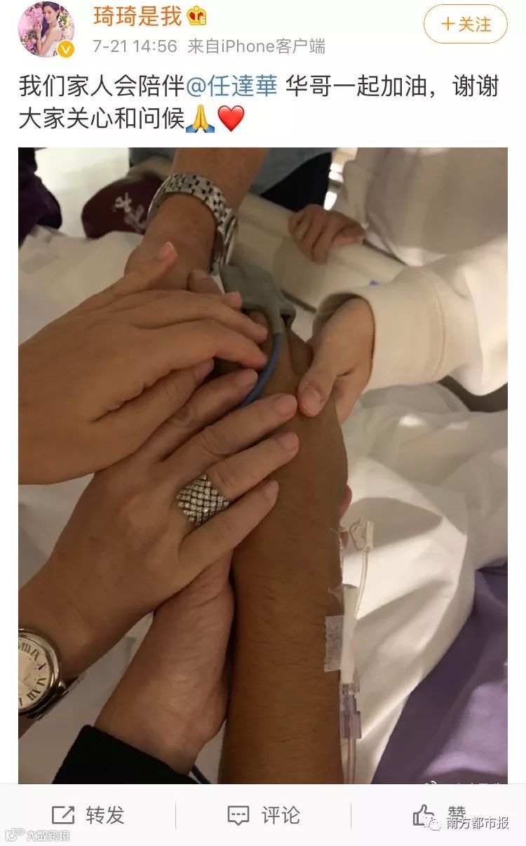 昨日,妻子琦琦亦曾发微博给丈夫打气:“我们家人会陪伴@任達華 华哥一起加油,谢谢大家关心和问候🙏❤️ ❤️ ”