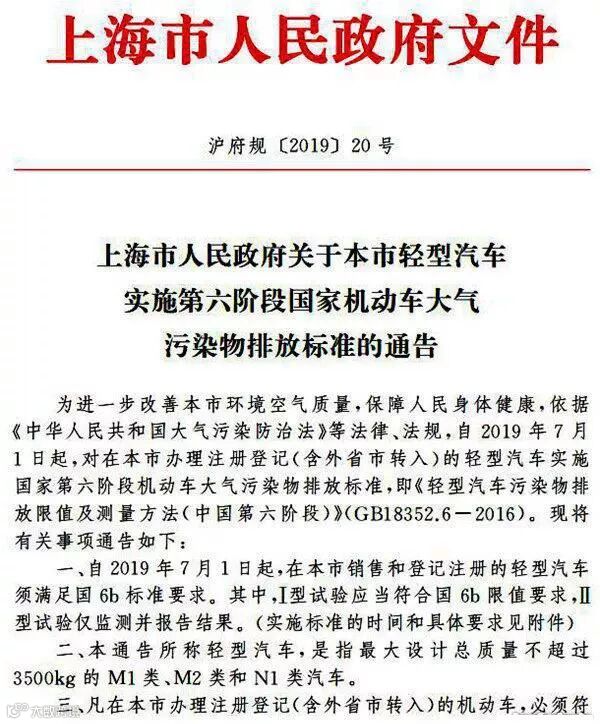 日前,上海市人民政府发布通告,指出将在2019年7月1日正式提前实施国六b排放标准,实施对象为最大设计总质量不超过3500kg的M1类、M2类和N1类(包括微卡、小卡)汽车。