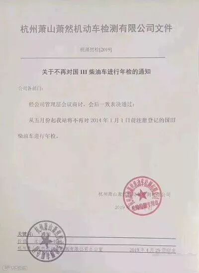 从5月起,杭州萧山萧然机动车检测站将不再对2014年1月1日前注册登记的国三柴油车进行年检!