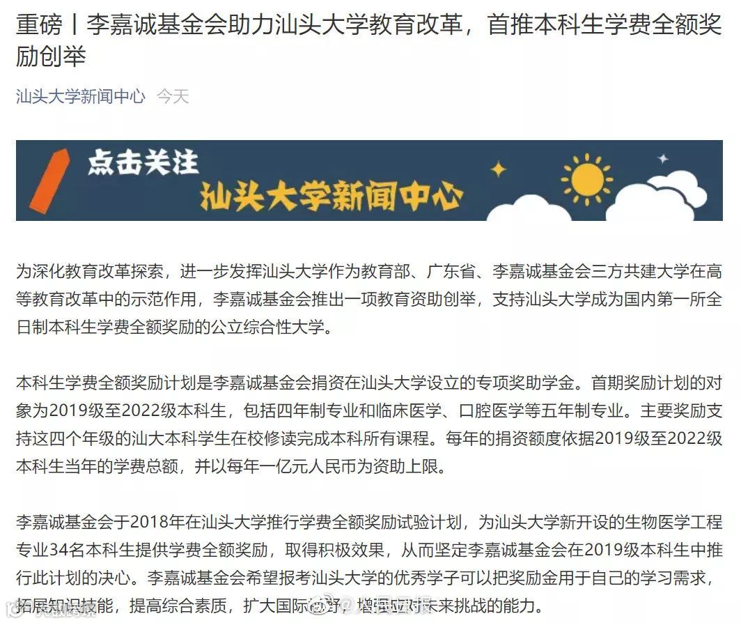 据了解,这项本科生学费全额奖励计划是李嘉诚基金会捐资在汕头大学设立的专项奖助学金,每年的捐资额度依据2019级至2022级本科生当年的学费总额,并以每年一亿元人民币为资助上限。