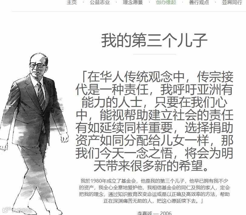 李嘉诚热衷于慈善事业。随着慈善事业的不断进行,李嘉诚的第三个儿子也随之诞生,那就是1980年由李嘉诚创立的李嘉诚基金会。