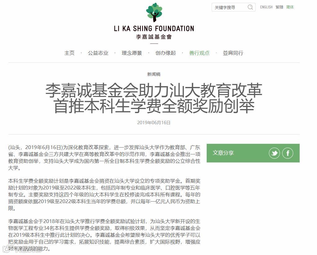 由此,汕头大学成为国内第一所全日制本科生学费全额奖励的公立综合性大学。据汕头大学新闻发布会介绍,这是为深化教育改革探索,进一步发挥汕头大学作为教育部、广东省、李嘉诚基金会三方共建大学在高等教育改革中的示范作用,李嘉诚基金会推出的一项教育资助创举。