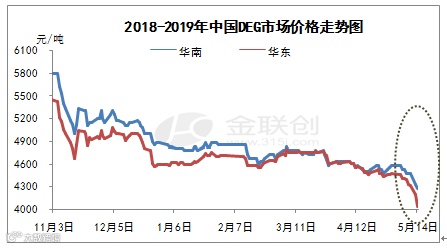 5月10日,特朗普政府确定对2000亿美元中国输美商品加征的关税从10%上调至25%;5月13日,中国政府宣布将于2019年6月1日起对美国部分进口商品加征5%-25%不等的关税;13日晚间,美国紧随其后又对剩余的3250亿美元的中国商品加征25%的关税。不断激化的贸易战对于中国化工市场的影响不容小觑,化工大宗商品出现剧烈震荡,周内二甘醇大幅下跌,给5月本就偏弱的二甘醇市场再次加压。