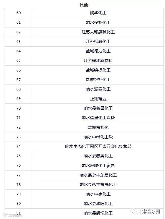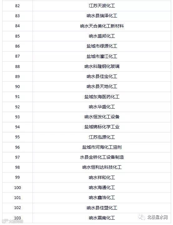 自“3.21”化工厂爆炸事故发生之后,江苏省盐城市决定永久性关停响水化工园区,园区内共有100多家化工企业,网传的企业名单如下: