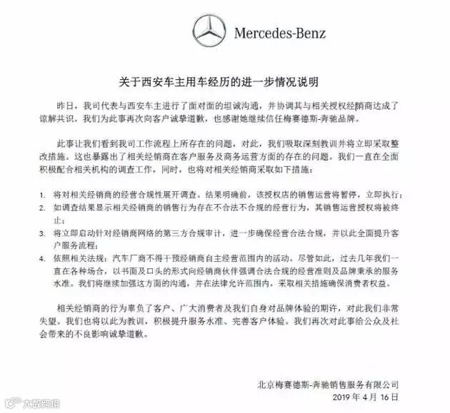 4月15日,我司代表与西安车主进行了面对面的坦诚沟通,并协调其与相关授权经销商达成了谅解共识。我们为此事再次向客户诚挚道歉,也感谢她继续信任梅赛德斯-奔驰品牌。