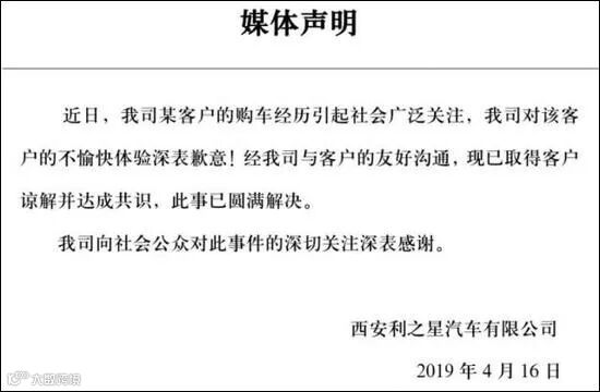 西安利之星也发布声明称,事件得到圆满解决。