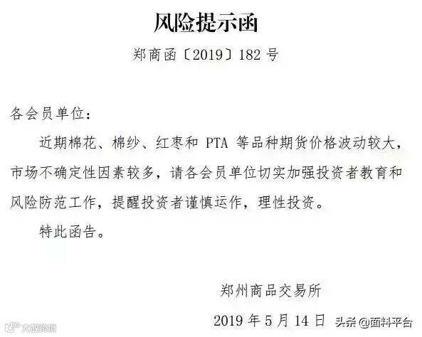 5月14日,国内棉花期货延续跌势,郑棉、棉纱期货主力合约双双跌停,郑棉期货主力合约跌7.03%,报13820元,棉纱期货主力合约跌6.91%,报22165元。郑商所也于今天发布了风险提示函,提醒投资者注意风险防范工作。