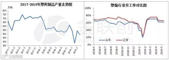 下游刚需转淡,是长期弱势行情的根本原因。首先看塑料制品产量,2019年月度供应量均不及往年同期。换言之,塑料制品新增量下降,相应对塑料原材料需求量亦减少,以至于场内颗粒货源流通节奏缓慢。再看下游塑编行业开工,2019年开工率较去年同期偏低5%左右,下游开工率降低,直接影响到新料PP、回料PP的消耗量。在经历过3月份的传统旺季后,4月中旬后回料市场出货已经减量,5月份之后刚需不断转淡,甚至高端产品交易近乎停滞,企业在此压力下选择不断试探性降价。