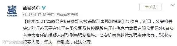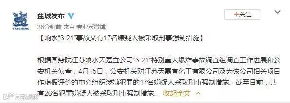 根据国务院江苏响水天嘉宜公司“3•21”特别重大爆炸事故调查组调查工作进展和公安机关侦查,4月15日,公安机关对江苏天嘉宜化工有限公司及为该公司相关项目作虚假评价的中介组织涉嫌犯罪的17名嫌疑人采取刑事强制措施。截至目前,共有26名犯罪嫌疑人被采取刑事强制措施。