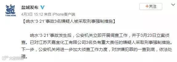 对江苏天嘉宜化工有限公司3名负有重大责任的嫌疑人采取刑事强制措施。
