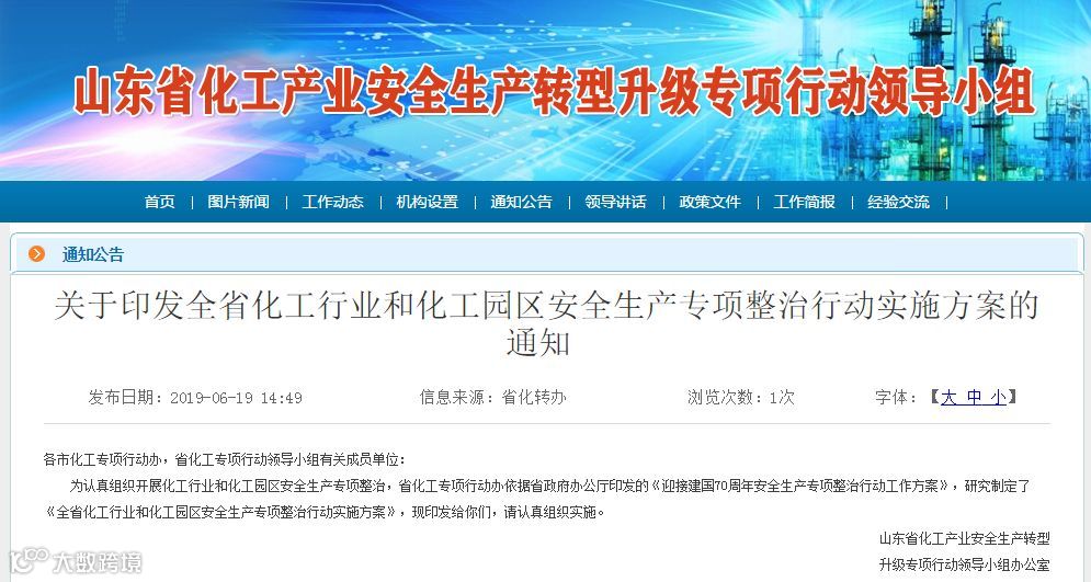 近日,山东省化工产业安全生产转型升级专项行动领导小组发布了《关于印发全省化工行业和化工园区安全生产专项整治行动实施方案的通知》,通知指出要进一步深化化工行业和化工园区问题隐患排查整治,有效防范遏制生产安全事故发生,确保建国70周年全省化工领域安全生产形势稳定。要求开展园区突出问题排查整治,强化化工生产企业评级评价结果运用,加强重点企业安全整治。