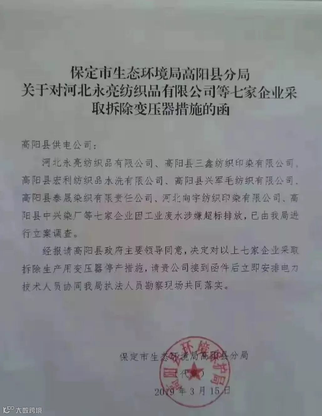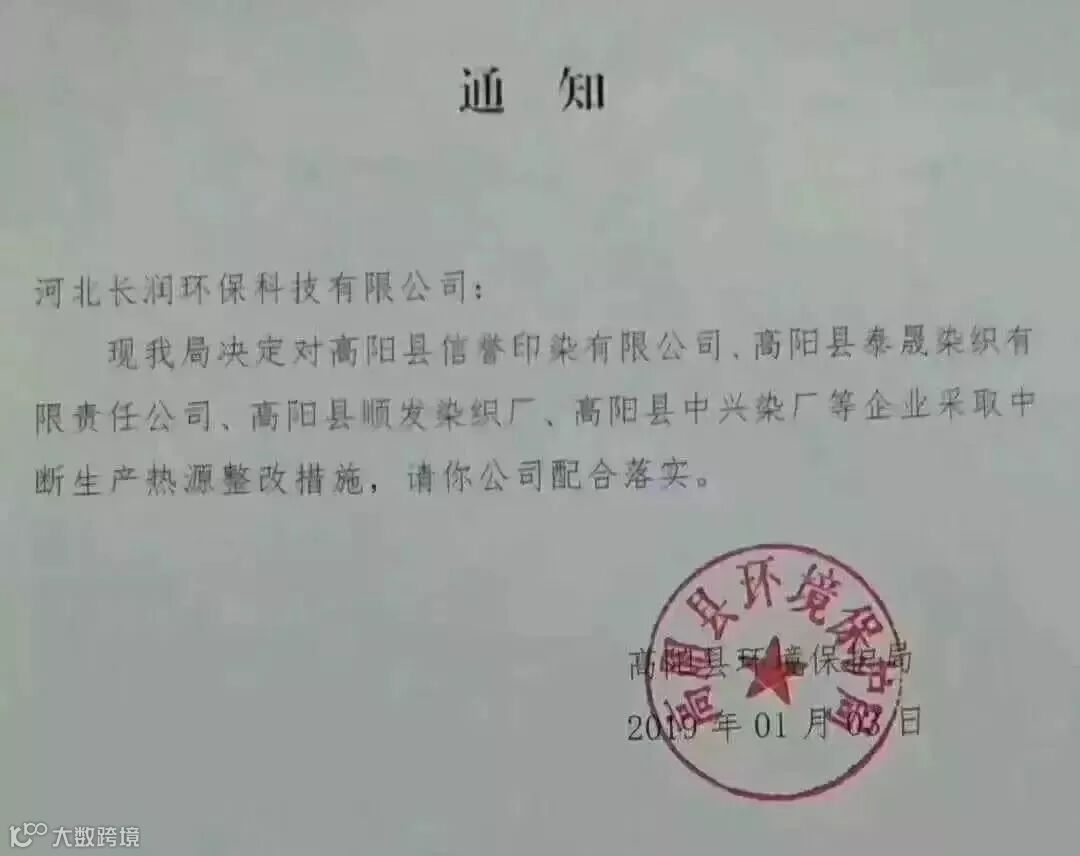 采取停止措施不是先例,2019年1月,高阳县环保局曾向河北长润环保科技有限公司发出通知,对5家印染企业采取中断生产热源整改措施。